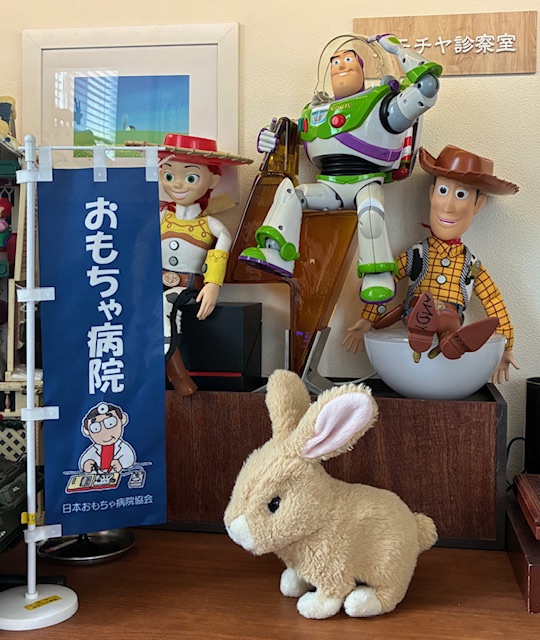 修理完了してお迎え待ちです、両側の病院スタッフのエルモも嬉しそうです